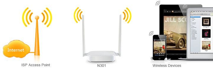 N301 can work as client mode to connect to ISP network or uplink AP wirelessly to share the Internet to every corner,elimating the dead point.